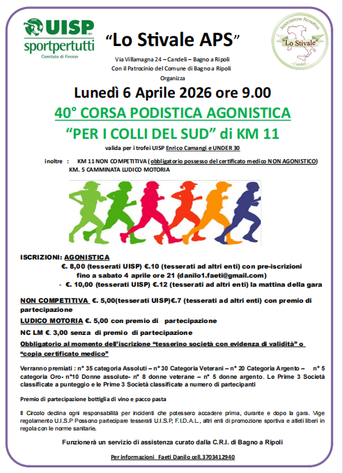 06 gennaio 202651a Maratonina della Befana. Chiusura iscrizioni domenica 4 Gennaio ore 12RITROVO VIA PIO FEDI 7 ISOLOTTO. PARTENZA ORE 9.30 Dettagli 11 gennaio 202648 TROFEO SASI - chiusura iscrizioni 9 gennaio ore 12!CASA DEL POPOLO DI GRASSINA ORE 9.00 Dettagli 11 gennaio 202648 TROFEO SASI LE LUDICO MOTORIE -chiusura iscrizioni 9 gennaio ore 12!!!!CASA DEL POPOLO DI GRASSINA ORE 9.00 Dettagli 11 gennaio 202616 TROFEO CALVINO CANTINI DECAMERUN chiusura iscrizioni 8 gennaio ore 12PIAZZA DEI MACELLI CERTALDO ORE 9.30 Dettagli 18 gennaio 2026GARA DEL MESE!!!! FIRENZE FIESOLE FIRENZE- CHIUSURA ISCRIZIONI IL 15 GENNAIO ORE 12ORE 9 STADIO CERRETI Dettagli 18 gennaio 202644 TROFEO SAMMARTINESE CHIUSURA ISCRIZIONI VENERDI' 16 ORE 12 PUNTUALISTADIO ZATOPEK CAMPI BISENZIO ORE 9.00 Dettagli 01 febbraio 202639 trofeo oltrarno. Chiusura iscrizioni 30 gennaio ore 12!CIRCOLO LE VIE NUOVE ORE 9 Dettagli 08 febbraio 2026MARATONINA DE' 6 PONTI "LA MEZZA DI AGLIANA"AGLIANA Dettagli 08 febbraio 20268 TROFEO BIGMAT COMPETITIVA CHIUSURA ISCRIZIONI VENERDI 6 FEBBRAIO ORE 12NUOVO SHOWROOM HABIMAT FOCARDI E CERBAI, IN VIALE ARIOSTO 500/502 - SESTO F.NO Dettagli 13 febbraio 2026RUNFORLOVE 2026 CHIUSURA ISCRIZIONI GIOVEDI 12 FEBB ORE 12DOVE VUOI Dettagli 15 febbraio 2026MEZZA MARATONA CITTA' DI SCANDICCI - CHIUSURA ISCRIZIONI 10 FEBBRAIO ORE 12 IN PUNTOPIAZZA RESISTENZA 50018 SCANDICCI FI Dettagli 15 febbraio 2026MEZZA MARATONA CITTA' DI SCANDICCI - CHIUSURA ISCRIZIONI 7 GENNAIO ORE 12 IN PUNTOPIAZZA RESISTENZA 50018 SCANDICCI FI ITA Dettagli 22 febbraio 20266 VITELLO TRAIL - CHIUSURA ISCRIZIONI VENERDI' 20 ORE 12!!!CIRCOLO RENATO MURRI DI ELLERA IN VIA ARETINA 306 PARTENZA ORE 9.15 Dettagli 01 marzo 2026SCARPIRINATA NARNALESECIRCOLO GRASSI VIA PISTOIESE 502 NARNALI PRATO Dettagli 01 marzo 2026BOAR TO RUN - chiusura iscrizioni il 27 febbraio ore 12PIAZZA MATTEOTTI GREVE IN CHIANTI Dettagli 07 marzo 202639a Rosamimosa chiusura iscrizioni giovedì 5 Marzo ore 12IMPIANTO SPORTIVO BRUNO BETTI VIA DEL FILARETE 5/A Dettagli 08 marzo 2026LA STRAPAZZA CHIUSURA ISCRIZIONI IL 6 MARZO ORE 12STADIO DI LASTRA A SIGNA VIA DELLO STADIO 1 ORE 9.30! Dettagli 08 marzo 2026LA STRAPAZZA CHIUSURA ISCRIZIONI IL 6 MARZO ORE 12STADIO DI LASTRA A SIGNA VIA DELLO STADIO 1 ORE 9.30! Dettagli 15 marzo 202643ª Maratonina di Tavarnelle chiusura iscrizioni il 13 marzo alle ore 12P.ZZA MATTEOTTI TAVARNELLE VAL DI PESA – COMUNE DI BARBERINO TAVARNELLE (FI) Dettagli 22 marzo 202638 CORRI ALLA ROMOLA CHIUSURA ISCRIZIONI 19 MARZO 2026 ORE 12SEDE DELLA PODISTICA VALDIPESA IN VIA DELLA TREGGIAIA 45B LOC. ROMOLA Dettagli 29 marzo 2026Firenze Half marathon non competitivaFIRENZE P.ZZA S. CROCE Dettagli 29 marzo 2026Firenze HalfmarathonPIAZZA SANTA CROCE Dettagli 29 marzo 2026Firenze Halfmarathon 2026 - chiusura iscrizioni 18 dicembre ore 12.00PIAZZA SANTA CROCE Dettagli 29 marzo 2026Firenze Halfmarathon 2026 - chiusura iscrizioni 20 gennaio ore 12.00PIAZZA SANTA CROCE Dettagli 06 aprile 202640° CORSA PER I COLLI DEL SUD chiusura iscrizioni il 3 aprile ore 12CIRCOLO LO STIVALE VIA VILLAMAGNA,24 CANDELI ORE 9 Dettagli 06 aprile 202640° CORSA PER I COLLI DEL SUD chiusura iscrizioni il 3 aprile ore 12CIRCOLO LO STIVALE VIA VILLAMAGNA,24 CANDELI ORE 9 Dettagli 12 aprile 20265° Trail “Tramonto di Un’ Alba” chiusura iscrizioni il 10 aprile alle ore 12 preciseVIA CANTAGALLO, COIANO, PRATO, TOSCANA, 59100, ITALIA PARTENZA LIBERA DALLE 7.30 ALLE 9.30 Dettagli 19 aprile 2026Mezza Maratona Città di Prato PER TESSERATI FIDAL chiusura iscrizioni il 15 aprile alle ore 12!PARTENZA ORE 9.30 DA VIALE PIAVE, PRATO, ARRIVO VIALE PIAVE Dettagli 19 aprile 2026SCATTA ALLE CASCINE CHIUSURA ISCRIZIONI IL 17 APRILE ALLE ORE 12PIAZZALE KENNEDY - PARCO DELLE CASCINE - ORE 9.30 Dettagli