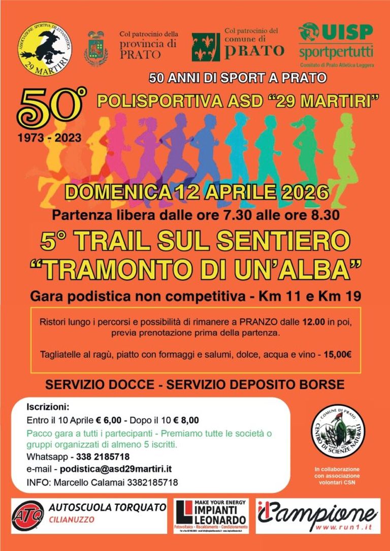 12 aprile 20265° Trail “Tramonto di Un’ Alba” chiusura iscrizioni il 10 aprile alle ore 12 preciseVIA CANTAGALLO, COIANO, PRATO, TOSCANA, 59100, ITALIA PARTENZA LIBERA DALLE 7.30 ALLE 9.30 Dettagli 19 aprile 2026Mezza Maratona Città di Prato PER TESSERATI FIDAL chiusura iscrizioni il 15 aprile alle ore 12!PARTENZA ORE 9.30 DA VIALE PIAVE, PRATO, ARRIVO VIALE PIAVE Dettagli 19 aprile 2026SCATTA ALLE CASCINE CHIUSURA ISCRIZIONI IL 17 APRILE ALLE ORE 12PIAZZALE KENNEDY - PARCO DELLE CASCINE - ORE 9.30 Dettagli 03 maggio 2026TRASFERTA NAVE A TRIESTE 3 MAGGIO 2026 - CHIUSURA ISCRIZIONI 2 DICEMBRE 25 ORE 12!!!TRIESTE PARTENZA DA DUINO E ARRIVO A TRIESTE IN PIAZZA DELL'UNITA' Dettagli 17 maggio 202610KM DA GUSTAREBERTACCIA, SCHIGNANO Dettagli