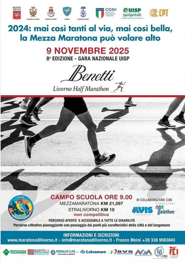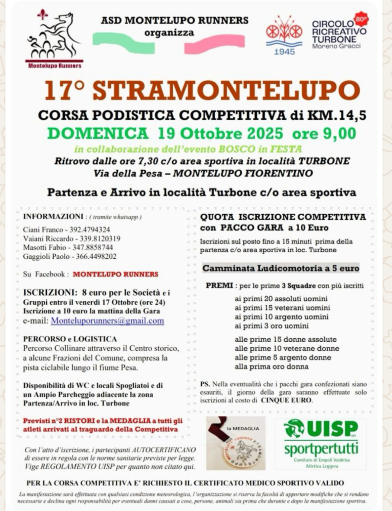 19 ottobre 202517a STRAMONTELUPO chiusura iscrizioni giovedi 16 Ottobre ore 12PARTENZA ORE 9 IN LOCALITÀ TURBONE VIA DELLA PESA MONTELUPO F.NO Dettagli 26 ottobre 2025TROFEO LE PANCHEFIRENZE Dettagli 26 ottobre 2025MEZZA MARATONA CITTA' DI AREZZO CHIUSURA ISCRIZIONI 14 OTTOBRE 2025 ORE 12!!!PARTENZA ORE 9.30 PIAZZA GUIDO MONACO Dettagli 01 novembre 202550 CORSA DELL'OLIO CHIUSURA ISCRIZIONI 29 ottobre 2025 ore 12!!!PARTENZA ORE 9 STADIO COMUNALE VIA KENNEDY Dettagli 01 novembre 202550 CORSA DELL'OLIO CHIUSURA ISCRIZIONI 29 OTTOBRE 2025PARTENZA ORE 9 STADIO COMUNALE VIA KENNEDY Dettagli 09 novembre 2025LA 30 'N PIANA CHIUSURA ISCRIZIONI 30 OTTOBRE ORE 12!!!PARTENZA ORE 8.30 PIAZZA DANTE CAMPI BISENZIO Dettagli 09 novembre 2025MEZZA DI LIVORNO - chiusura iscrizioni 4 novembre ore 12!PARTENZA ORE 9 PALAZZETTO DELLO SPORT “COSMELLI” VIA ALLENDE LIVORNO (ZONA IMPIANTI SPORTIVI) Dettagli 30 novembre 2025MARATONA DI FIRENZE - chiusura iscrizioni 14 ottobre 2025 ore 12.00PIAZZA DUOMO PARTENZA ORE 8.30 Dettagli