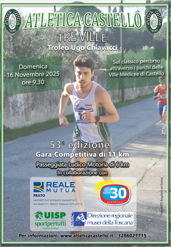 09 novembre 2025LA 30 'N PIANA CHIUSURA ISCRIZIONI 30 OTTOBRE ORE 12!!!PARTENZA ORE 8.30 PIAZZA DANTE CAMPI BISENZIO Dettagli 09 novembre 2025MEZZA DI LIVORNO - chiusura iscrizioni 4 novembre ore 12!PARTENZA ORE 9 PALAZZETTO DELLO SPORT “COSMELLI” VIA ALLENDE LIVORNO (ZONA IMPIANTI SPORTIVI) Dettagli 16 novembre 2025TRAIL DI SAN MARTINO CHIUSURA VENERDI' 14RUFINA Dettagli 16 novembre 202553° Circuito podistico TRE VILLE chiusura iscrizioni il novembre ore 12SEDE DELL’ATLETICA CASTELLO VIA R. GIULIANI 518 Dettagli 29 novembre 20253x7K Firenze Marathon Charity Run - chiusura iscrizioni il 25 novembre alle ore 12!!!PARTENZA ORE 10.30 DALL’IPPODROMO DEL VISARNO. Dettagli 30 novembre 2025MARATONA DI FIRENZE - chiusura iscrizioni 14 ottobre 2025 ore 12.00PIAZZA DUOMO PARTENZA ORE 8.30 Dettagli 03 maggio 2026TRASFERTA NAVE A TRIESTE 3 MAGGIO 2026 - CHIUSURA ISCRIZIONI 2 DICEMBRE 25 ORE 12!!!TRIESTE PARTENZA DA DUINO E ARRIVO A TRIESTE IN PIAZZA DELL'UNITA' Dettagli