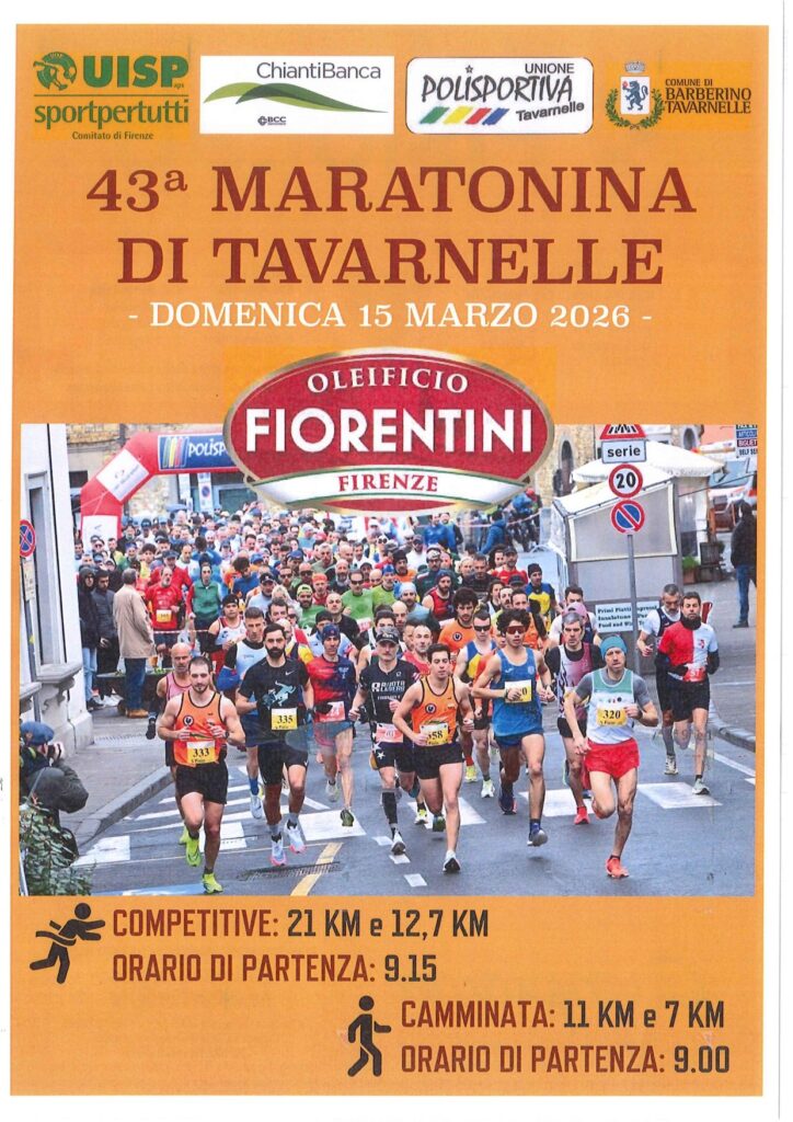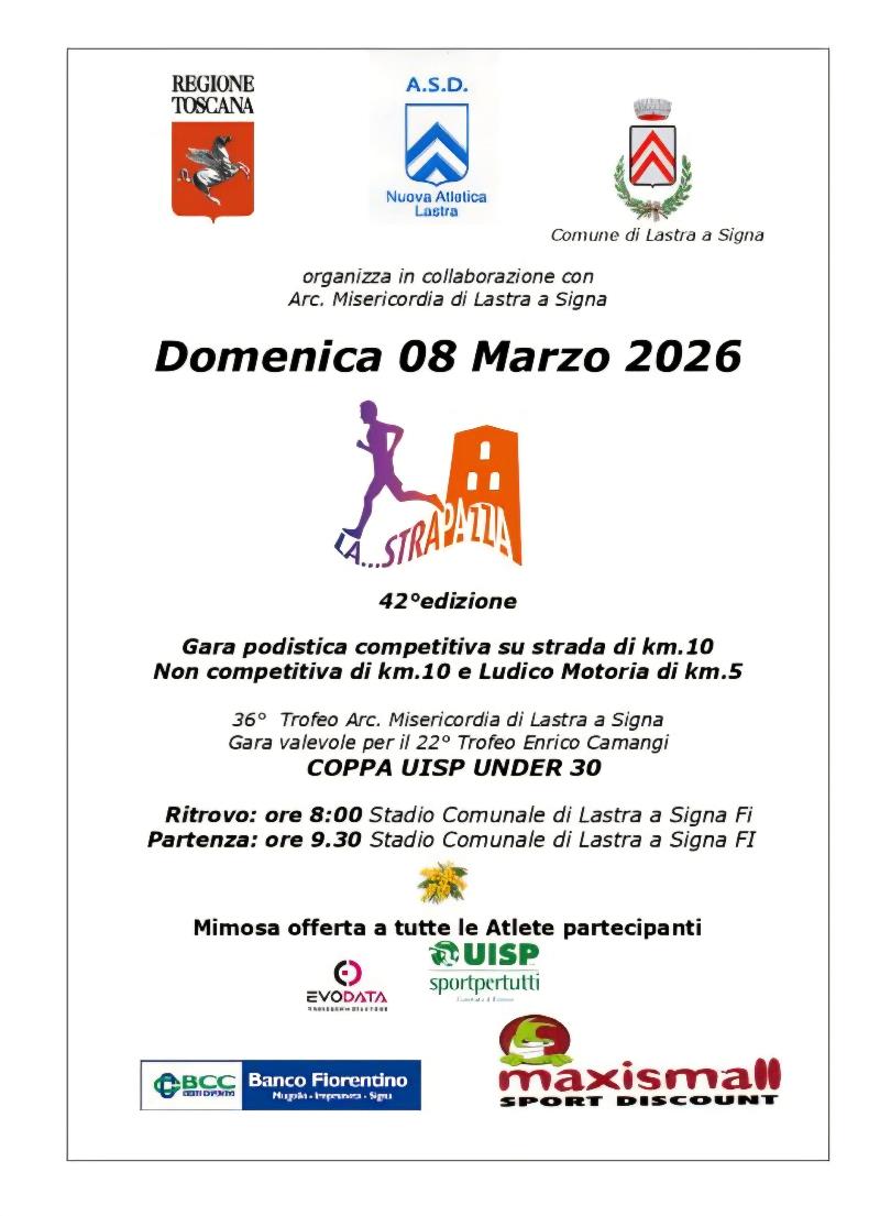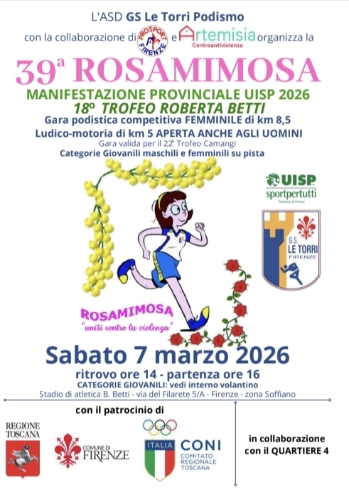 07 marzo 202639a Rosamimosa chiusura iscrizioni giovedì 5 Marzo ore 12IMPIANTO SPORTIVO BRUNO BETTI VIA DEL FILARETE 5/A Dettagli 08 marzo 2026LA STRAPAZZA CHIUSURA ISCRIZIONI IL 6 MARZO ORE 12STADIO DI LASTRA A SIGNA VIA DELLO STADIO 1 ORE 9.30! Dettagli 08 marzo 2026LA STRAPAZZA CHIUSURA ISCRIZIONI IL 6 MARZO ORE 12STADIO DI LASTRA A SIGNA VIA DELLO STADIO 1 ORE 9.30! Dettagli 15 marzo 202643ª Maratonina di Tavarnelle chiusura iscrizioni il 13 marzo alle ore 12P.ZZA MATTEOTTI TAVARNELLE VAL DI PESA – COMUNE DI BARBERINO TAVARNELLE (FI) Dettagli 22 marzo 202638 CORRI ALLA ROMOLA CHIUSURA ISCRIZIONI 19 MARZO 2026 ORE 12SEDE DELLA PODISTICA VALDIPESA IN VIA DELLA TREGGIAIA 45B LOC. ROMOLA Dettagli 29 marzo 2026Firenze Half marathon non competitivaFIRENZE P.ZZA S. CROCE Dettagli 29 marzo 2026Firenze Halfmarathon 2026 - chiusura iscrizioni 18 dicembre ore 12.00PIAZZA SANTA CROCE Dettagli 29 marzo 2026Firenze Halfmarathon 2026 - chiusura iscrizioni 20 gennaio ore 12.00PIAZZA SANTA CROCE Dettagli 29 marzo 2026Firenze HalfmarathonPIAZZA SANTA CROCE Dettagli 03 maggio 2026TRASFERTA NAVE A TRIESTE 3 MAGGIO 2026 - CHIUSURA ISCRIZIONI 2 DICEMBRE 25 ORE 12!!!TRIESTE PARTENZA DA DUINO E ARRIVO A TRIESTE IN PIAZZA DELL'UNITA' Dettagli
